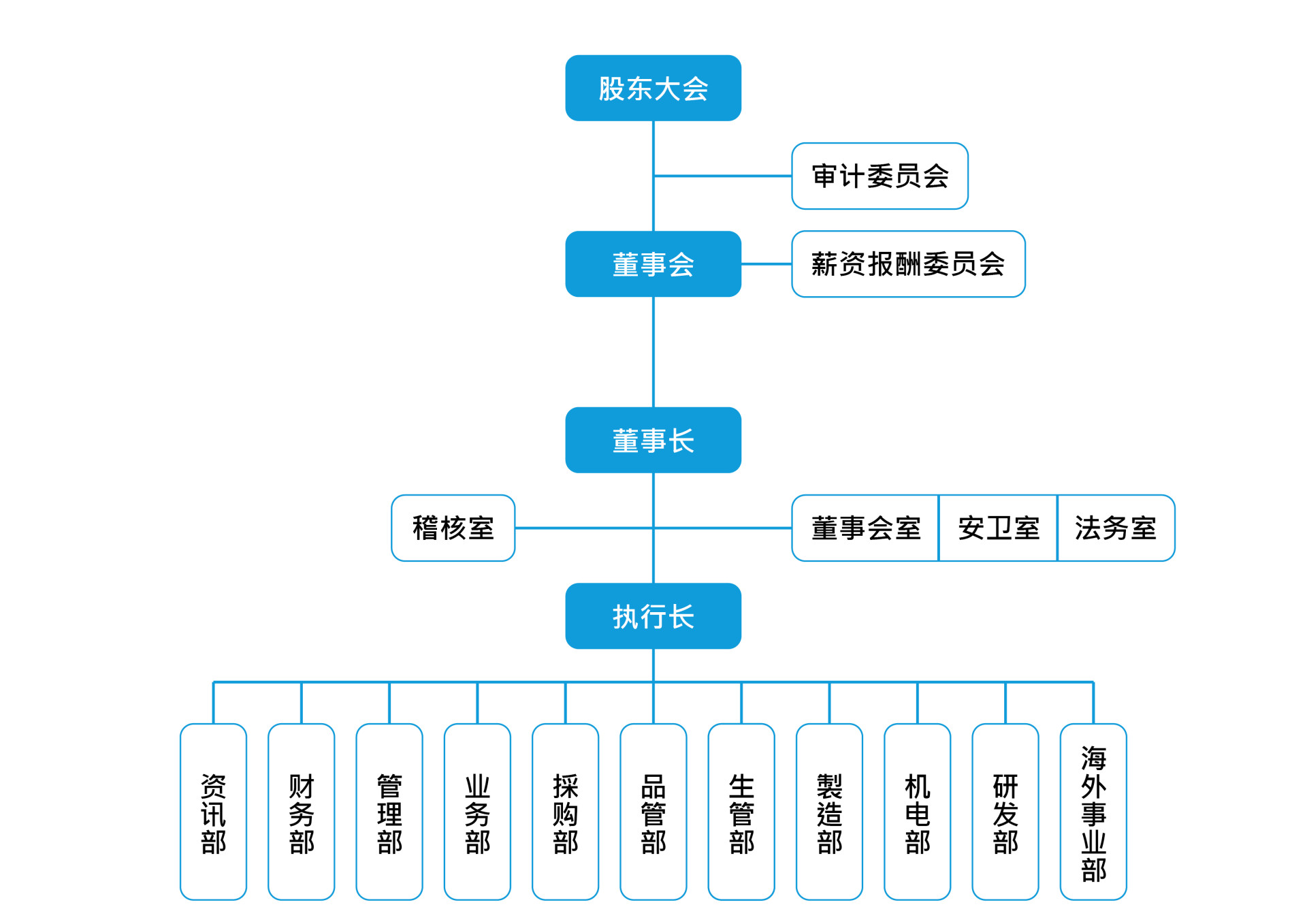 最高经营阶层:执行长,下辖业务部、财务部、 管理部、采购部、品管部、资讯室,技术与生产单位:研发部、制造部、机电部、生管部及海外事业部等。